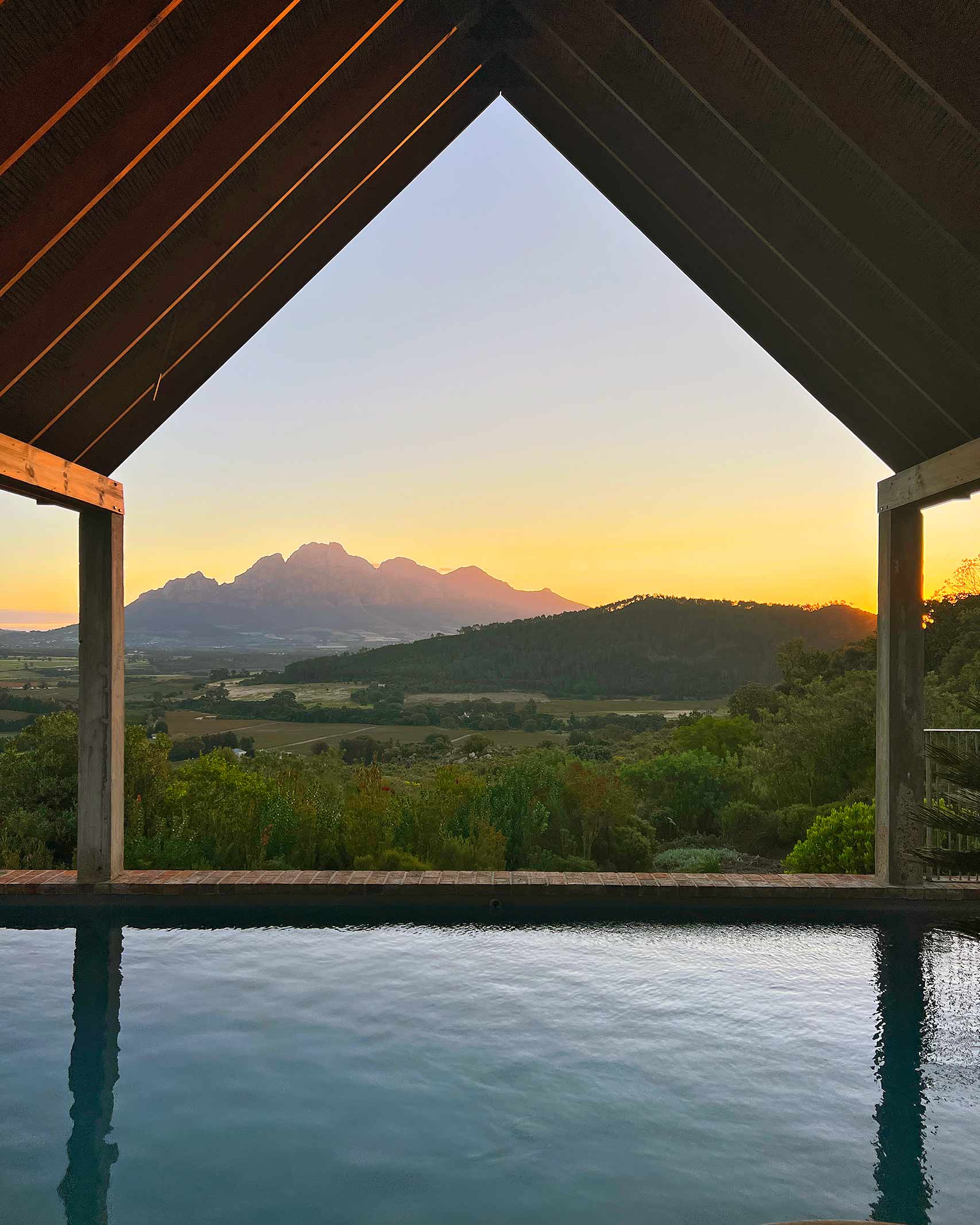 It truly is thrilling to find this place up here, not least because the farm’s many charms unfold in layers, each more evocative than the last. At first, guests lay eyes on a beautifully restored building fronted by a large natal fig overhung with air plants. Then, it’s on to a warm greeting from hosts Marc and James, followed by a first glimpse of 7 Koppies’s eclectic-cool interiors. If those don’t have you snapping away just yet, what comes next surely will: just beyond a communal kitchen and dining area, a large door with glass inserts beckons you into an adjoining outdoor area, which culminates in a 25-metre pool. Beyond that, the terrain slowly descends into Franschhoek Valley, allowing for showstopping views of the dramatic Simonsberg mountain straight ahead.
