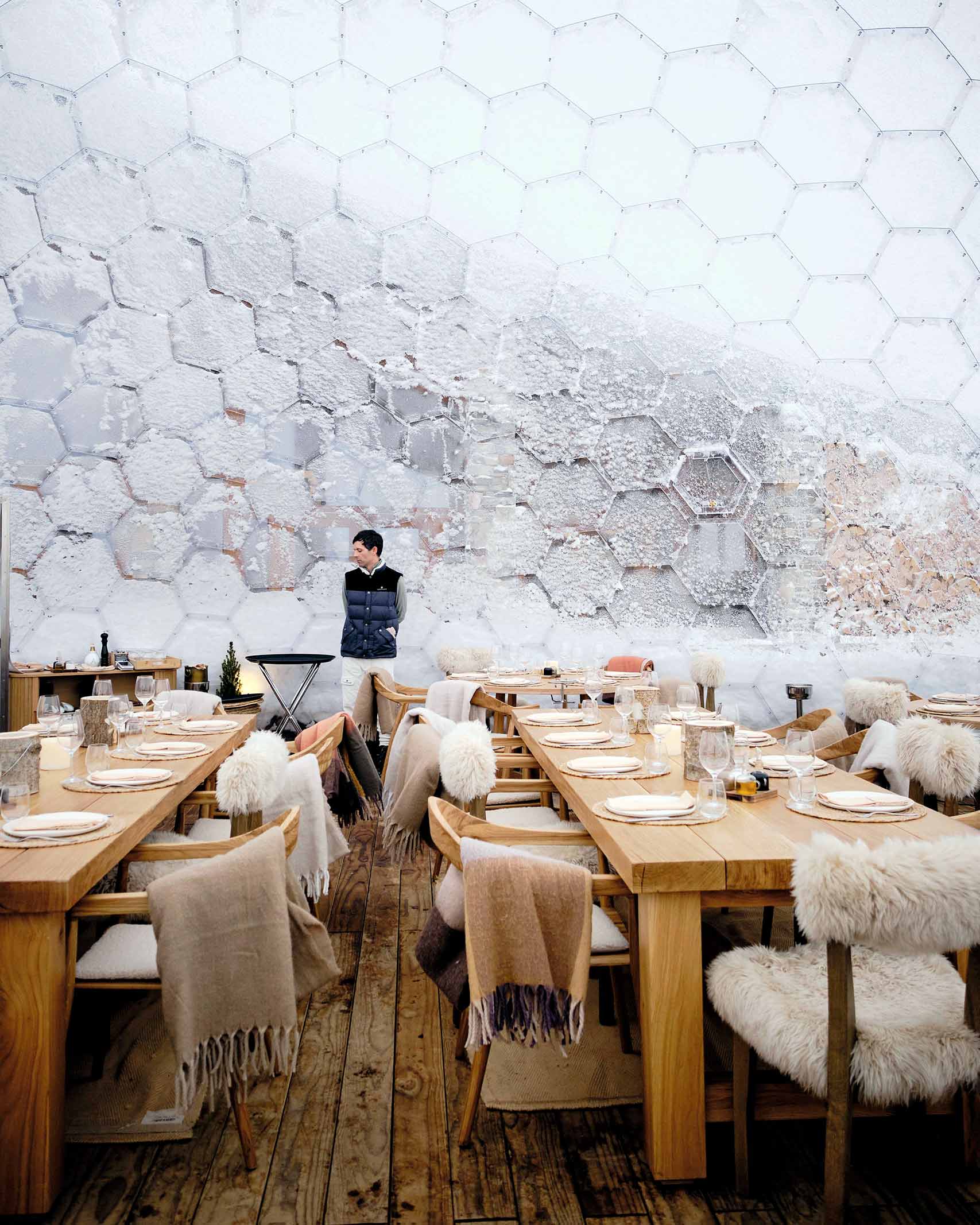 A sumptuous blend of Mediterranean beach chic and Alpine hygge (think tactile cream fabrics, stripped-pine furniture and monochrome mountain photographs), the new venue is the hottest spot in Andermatt, and arguably all the Alps, for lunch and après-ski, which segue effortlessly through to dinner and cocktails. A large south-facing terrace is dotted with custom-made timber gondolas, which serve as intimate dining spaces for up to four guests. The main attraction, however, is the 10m (32ft) wide, frameless, transparent geodesic dome (pictured, left), which provides some 100 guests and the club’s resident DJ with a sheltered dining (and dancing) space that remains viscerally connected to the spectacular mountain surroundings.