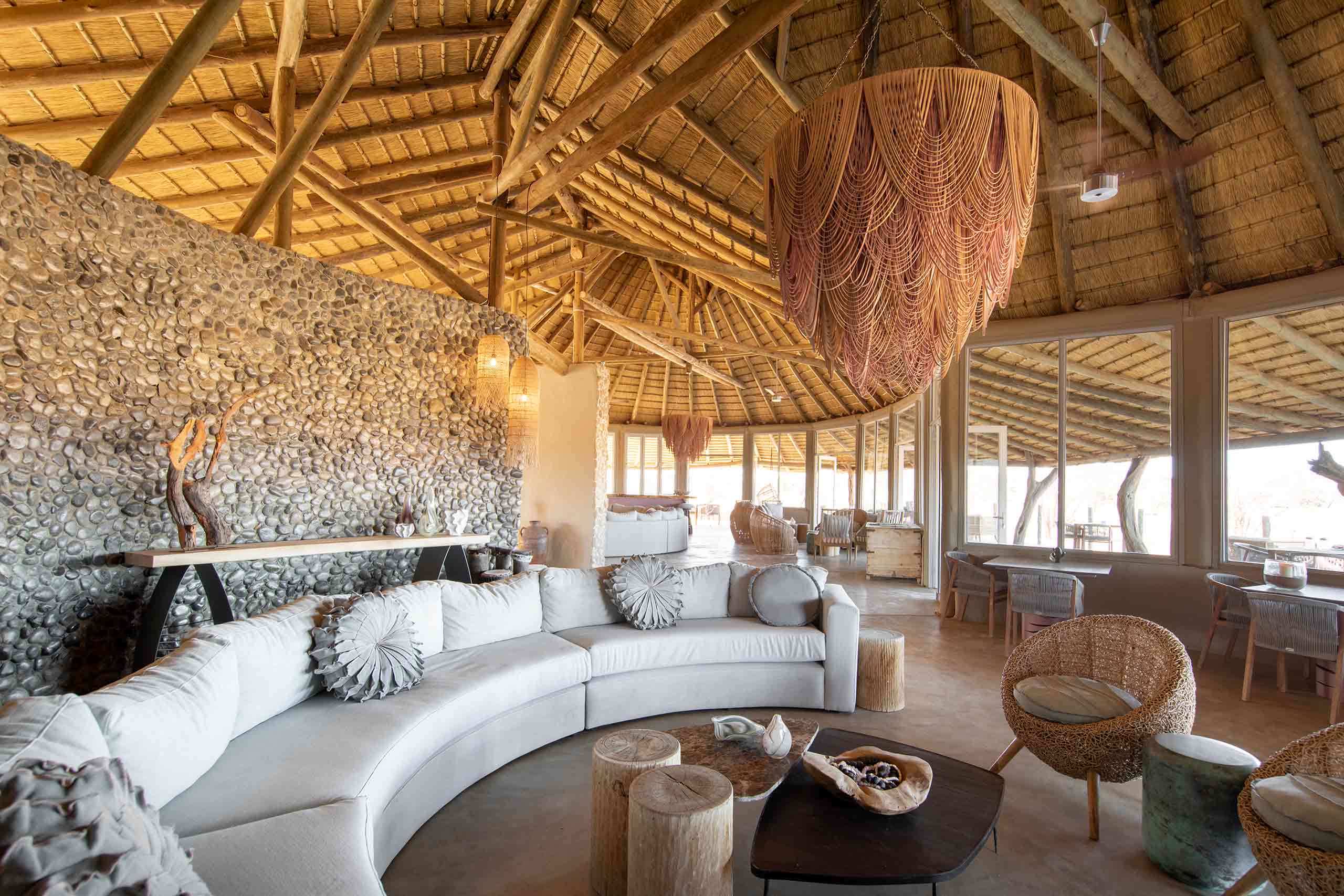 Her gorgeous design anchors the lodge with the large communal pavilion space, all curved walls and indoor-outdoor spaces beneath a cluster of cute, conical thatched roofs like wonky wizards’ hats. This hub encompasses a luxurious lounge, dining space, multiple cosy seating nooks, a bijou spa, wine cellar, library and a boutique offering stylish safari essentials and craft goodies with a local flavour.