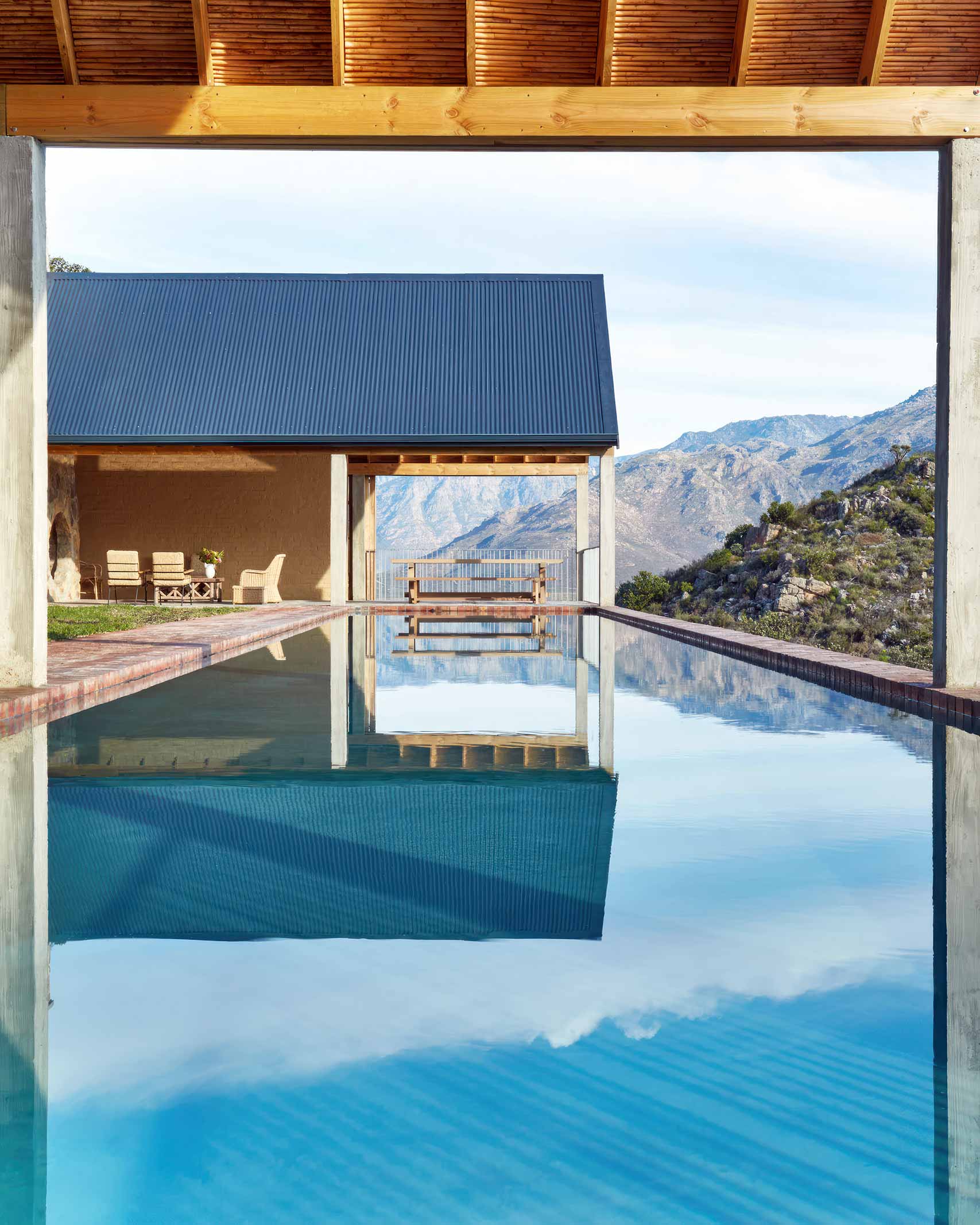 It truly is thrilling to find this place up here, not least because the farm’s many charms unfold in layers, each more evocative than the last. At first, guests lay eyes on a beautifully restored building fronted by a large natal fig overhung with air plants. Then, it’s on to a warm greeting from hosts Marc and James, followed by a first glimpse of 7 Koppies’s eclectic-cool interiors. If those don’t have you snapping away just yet, what comes next surely will: just beyond a communal kitchen and dining area, a large door with glass inserts beckons you into an adjoining outdoor area, which culminates in a 25-metre pool. Beyond that, the terrain slowly descends into Franschhoek Valley, allowing for showstopping views of the dramatic Simonsberg mountain straight ahead.