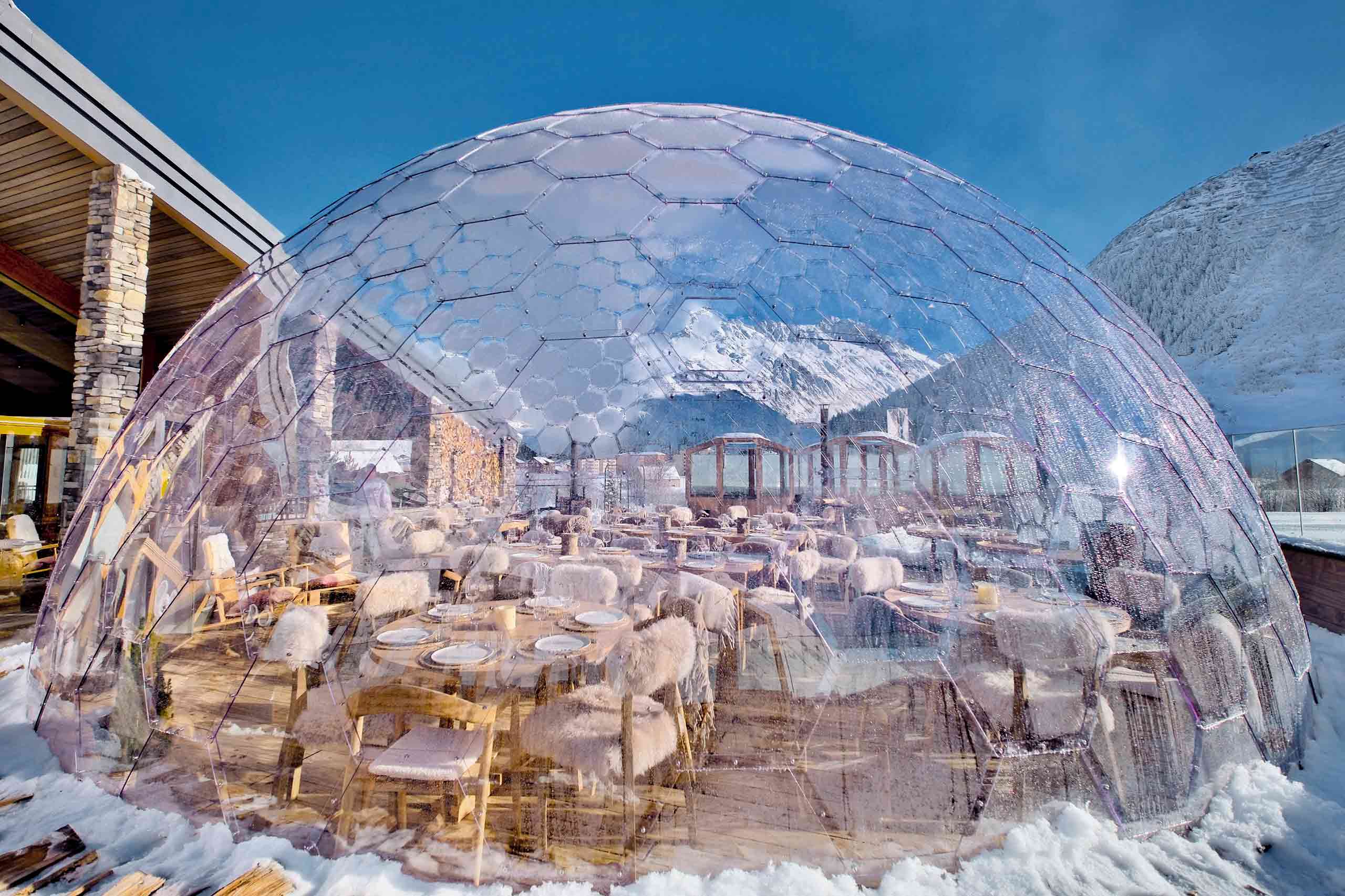 A sumptuous blend of Mediterranean beach chic and Alpine hygge (think tactile cream fabrics, stripped-pine furniture and monochrome mountain photographs), the new venue is the hottest spot in Andermatt, and arguably all the Alps, for lunch and après-ski, which segue effortlessly through to dinner and cocktails. A large south-facing terrace is dotted with custom-made timber gondolas, which serve as intimate dining spaces for up to four guests. The main attraction, however, is the 10m (32ft) wide, frameless, transparent geodesic dome (pictured, left), which provides some 100 guests and the club’s resident DJ with a sheltered dining (and dancing) space that remains viscerally connected to the spectacular mountain surroundings.