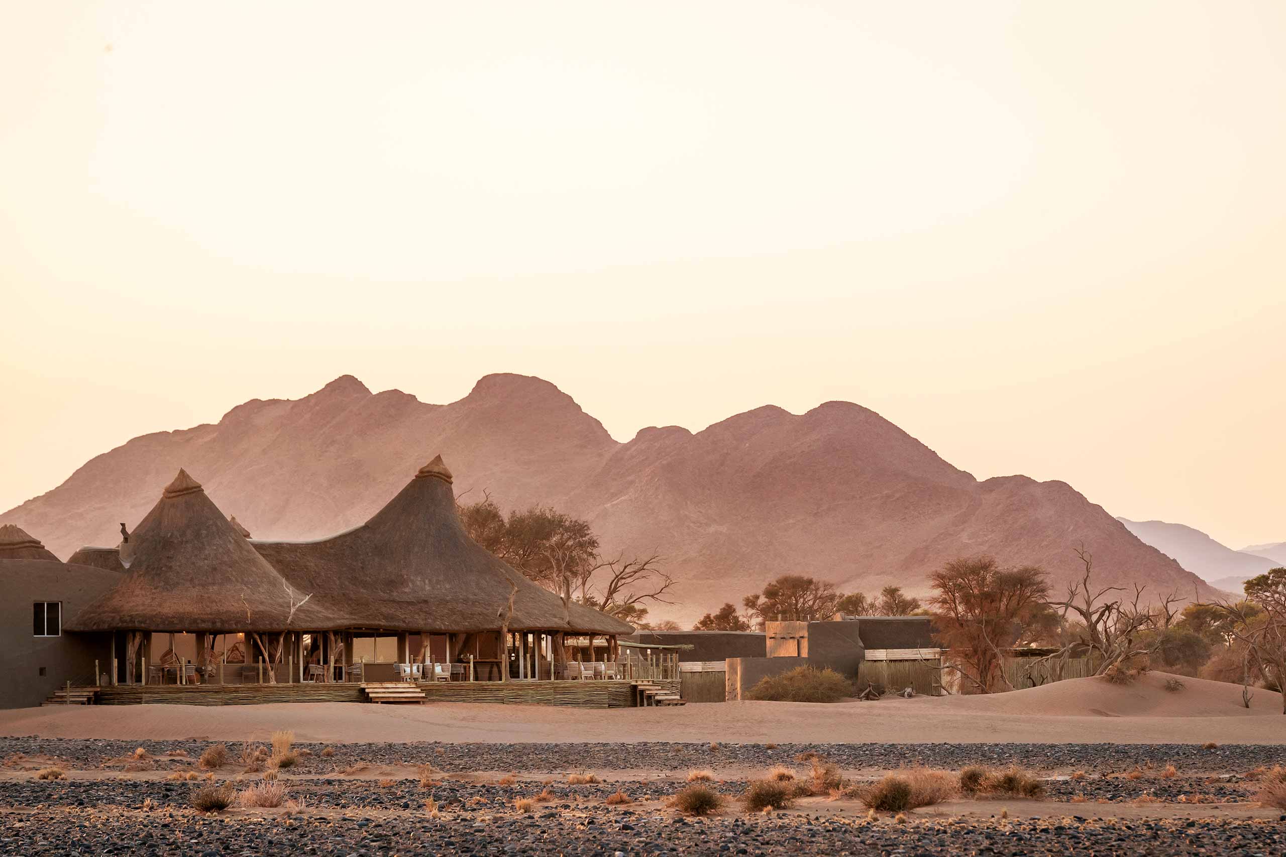 The lodge is a gateway not only to this part of the 27,000-hectare Kulala Wilderness Reserve (an exclusive-use entrance gives guests direct Sossusvlei access that swerves the main, day-tripper way-in) but also to perfect peace. Fully solar-powered, its easeful accommodations – 11 thatched villas, or kulalas (meaning to sleep, in the Ovambo language), each with wraparound deck, open-air lounge area and small plunge pool– are decorated in earthy, desert hues that cocoon guests in calmness and serenity.